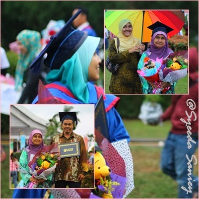 Makan dulu bekalan yang dibawa bersama sebelum bersiap. Jam dah pukul 12 tengahari. Ok macam lewat dah ditambah pulak dengan jalan nak masuk ke Dewan Muadzam Syah yang jem dalam suasana hujan renyai-renyai. Siap parking terus bergegas ke Dewan TSO untuk taklimat graduan. Mak ayah terus masuk dewan DMAS. Kat situlah baru jumpa kawan-kawan sama kos. Itupun tak semua..